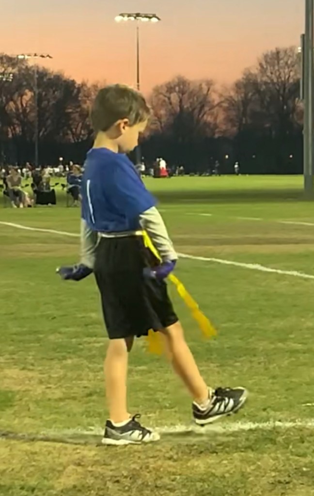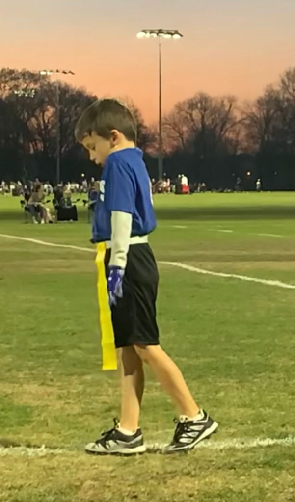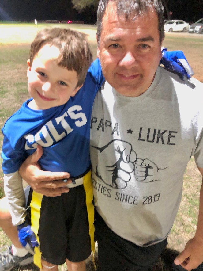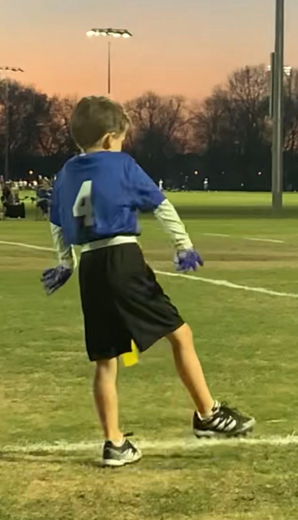 This time we were there to actually WATCH THE GAME because our grandson, #lukethomas, was starting his football career. While he did everything asked of him when it was his time to be ON the field, I think he’s favorite part of the game was doing sideline dances with his shadow! Earlier in the day his mom had taken him to get all the “accessories” (I’m a girl mom…is that the right word?), including a mouth-guard and a cool pair of gloves (just in case he ever touched the ball!). She made the mistake of mentioning how much the gloves looked like the ONE worn by Michael Jackson and so I’m thinking that inspired the dance moves throughout the game!